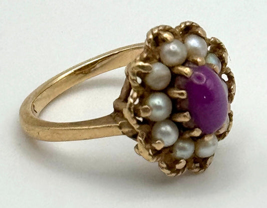 Vintage 14k Yellow Gold Ring Sz.6 w. a Ruby Cabochon & 10x Pearls (NeW)