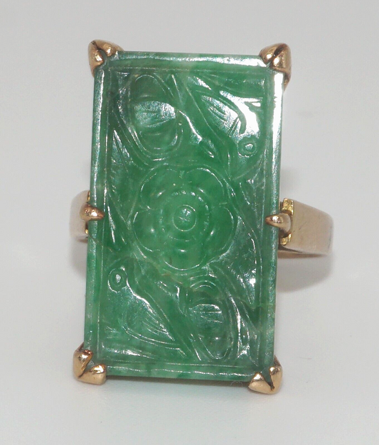 Vintage Art Deco 14k Yellow Gold Ring Sz. 9.25 w Carved Jadeite Accent (LeD)