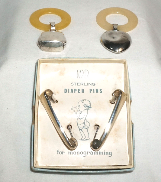 Vintage Baby Teething Rings & Sterling Diaper Pins Combined Lot (MiM)