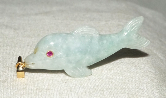 Vintage Chinese 14k Yellow Gold Jadeite Jade Dolphin Pendant w. Ruby Eyes (KiL)