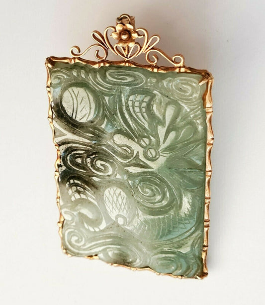 Vintage Chinese 14k Yellow Gold Jade Plaque Pendant w. Dragon Motif (GoH)#7a