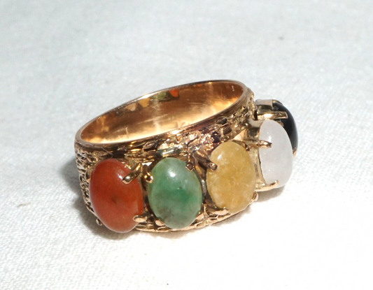 Vintage Chinese 14k Yellow Gold Ring Sz. 5 set w. 5x Multicolor Jades (BrM)L3