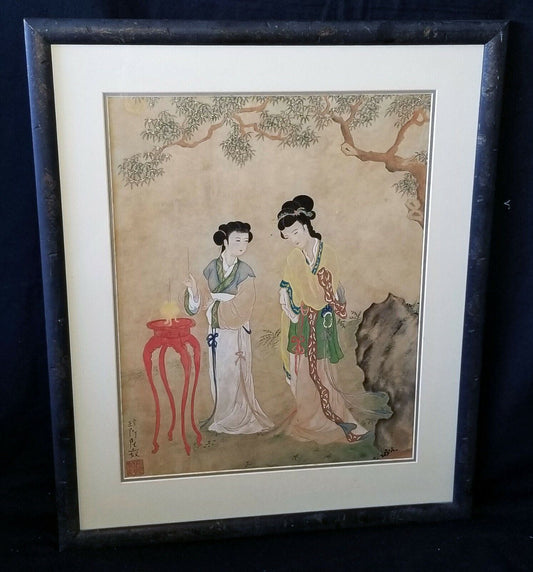 Vintage Chinese Framed Painting "Two Woman in a Garden" by Zhen O Jian Nu (WiR)