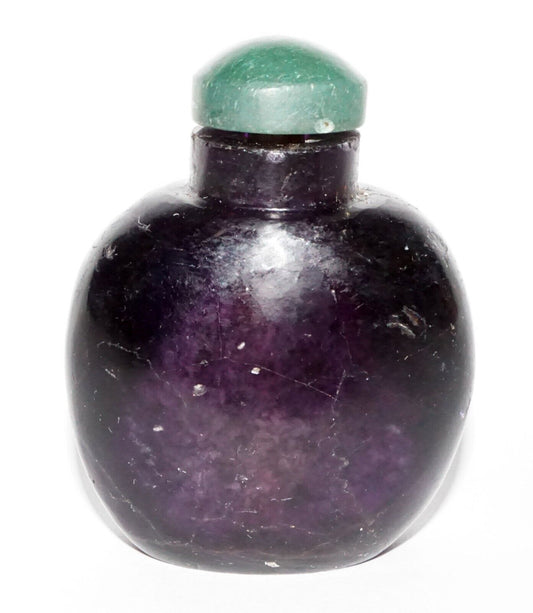 Vintage Chinese Dark Purple Fluorite Carved Snuff Bottle w. Green Stop (LeS) G8