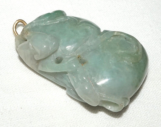 Vintage Chinese Double Gourd & Feline Motif Jadeite Jade Carved Pendant (AHB)