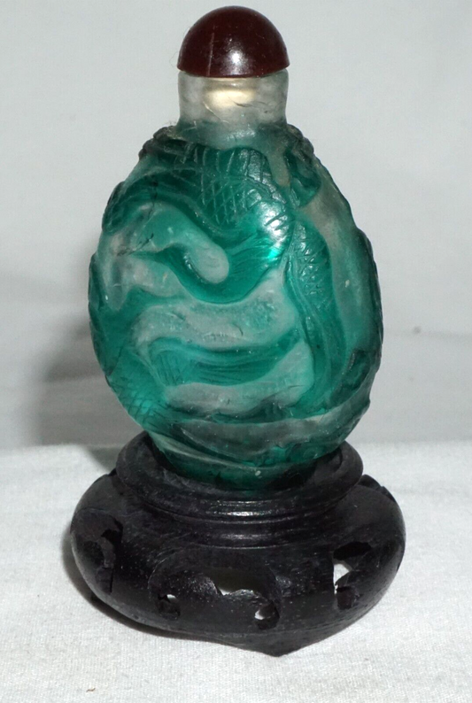 Vintage Chinese Green Overlay Glass Snuff Bottle w. Crane Motif (LLA) IC