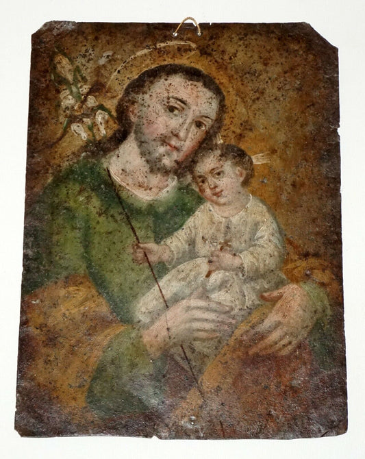 18/19C Russian Religious Icon Folk Painting on Tin Joseph & Baby Jesus (MeE)