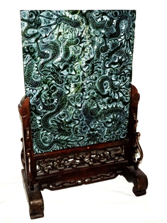 Vintage Chinese Nephrite Jade Table Screen w. Relief Writhing Dragon Stand (LeD)