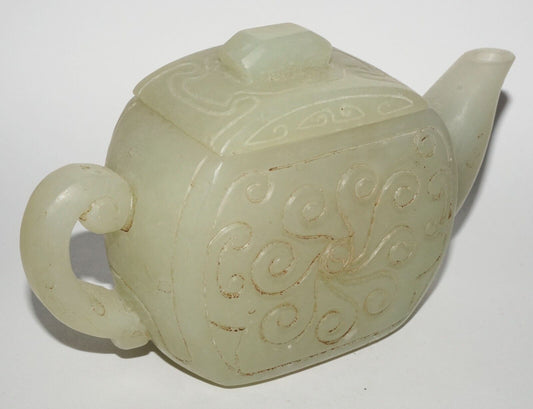 Vintage Chinese Nephrite Jade Carved Tea Pot w Incised Curvilinear Motifs (LeS)