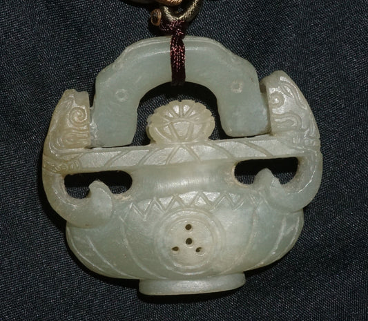 Vintage Chinese Nephrite Jade Flower Vase w. Hinged Handle Motif Pendant (---)