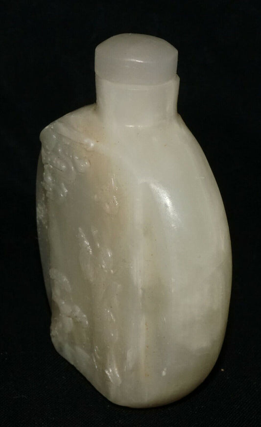 Vintage Chinese Opaque White Glass Snuff Bottle w. Molded Scholar Motif (LeS)#G2