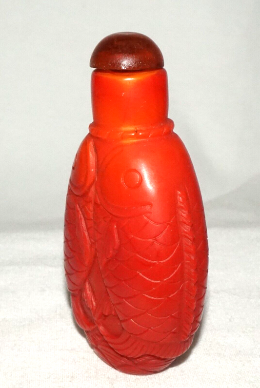 Vintage Chinese Red Glass Snuff Bottle w. Double Leaping Carp Motif (FeH)