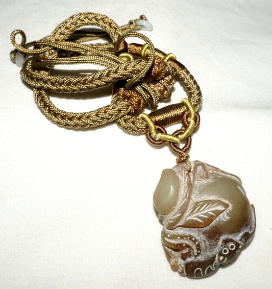 Vintage Chinese Soapstone Carving w Bat on Peach Motif & Cord Necklace (LeS)L20