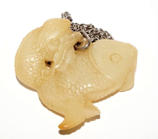 Vintage Chinese Yellow Jade Double Carp Motif Pendant w. Silver Chain (LeS) G9