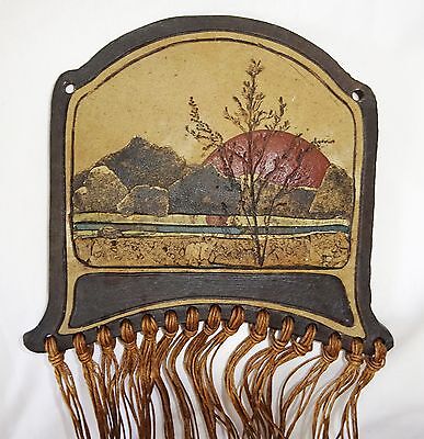 Vintage Earth tone Art Tile w. Landscape Motif & Fringes w Balls signed EK (Tam)