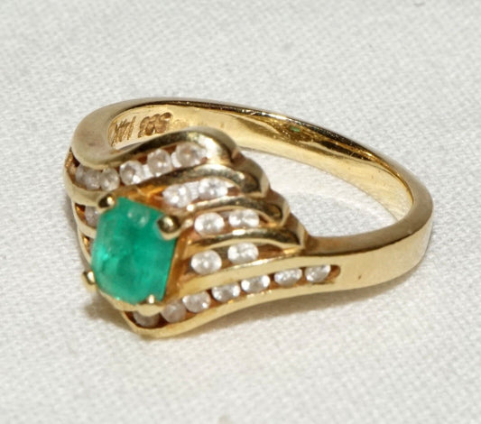 Vintage Modernist 14k Yellow Gold Ring Sz.5 w. 1x Emerald & 24x Diamonds (MHB)