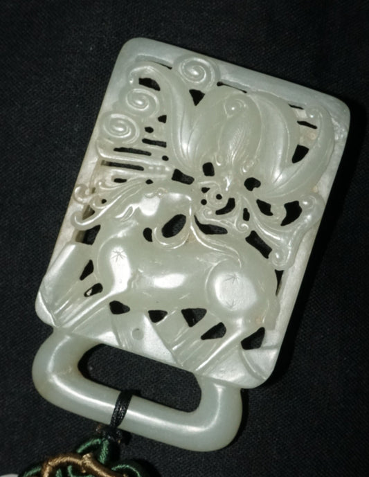 18C Chinese Grey Green Nephrite Jade Pierced Belt Buckle Deer & Bat (LeS)L23