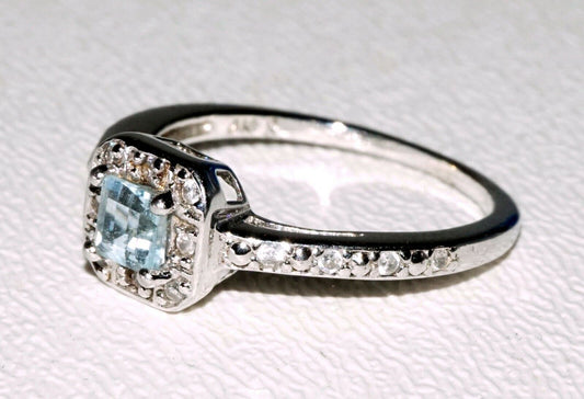 Vintage Sterling Silver Ring Sz.8.25 w. Aquamarine Cushion & Cubic Z's (SaR) #56