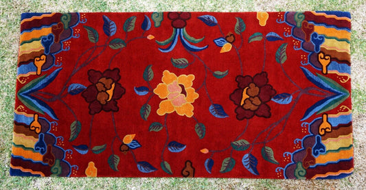 Vintage Tibetan Multi Color Floral Motif Rug 72" x 36" on Red Ground (Sug)