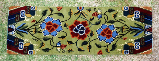 Vintage Tibetan Multi Color Floral Motif Rug 70" x 24" on Green Ground (Sug)