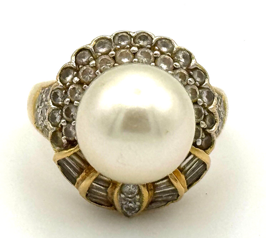 Vtg 18k Yellow Gold Ring Sz 6.75 Accented w Pearl Solitaire & Diamonds (TuC)