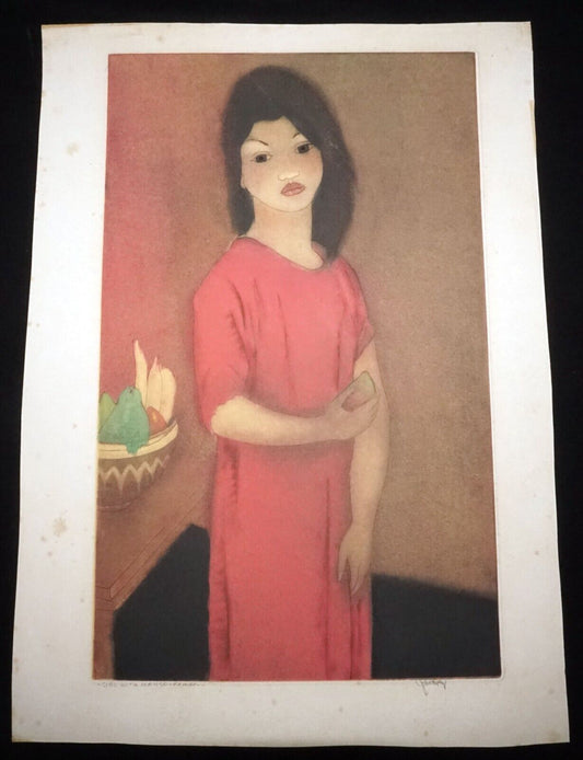 1940s Hawaii Aquatint Print Girl w. Mango Hawaii by John M. Kelly (1879-1962)(+)