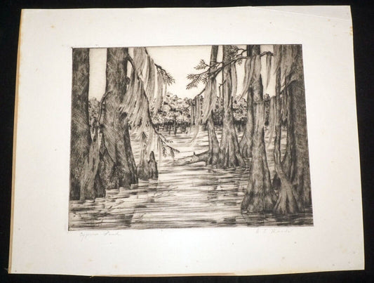 1940s US Florida Etching Print "Cypress Pond" by A.L. Woods (Kel)
