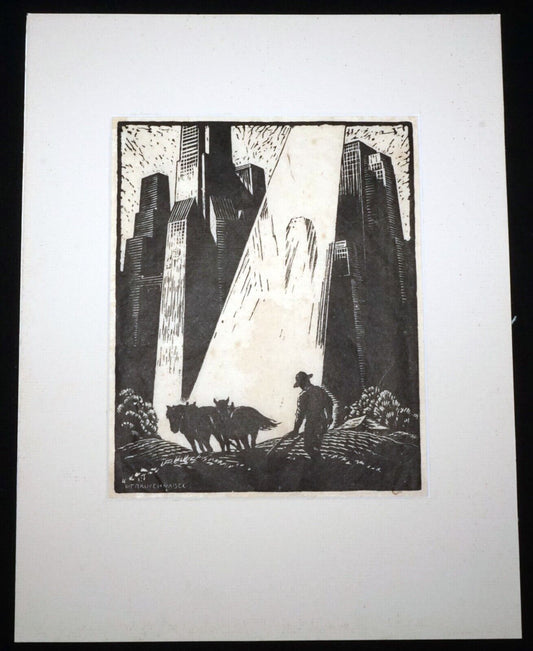 1940s US Lino Cut Print "Old & New" William Fredrick Rauschnabel (1883-1947)(FeH