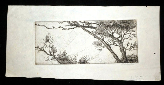 1940s Hawaii California Etching Print Trees & Mountains by L. Schwallie (Kel)