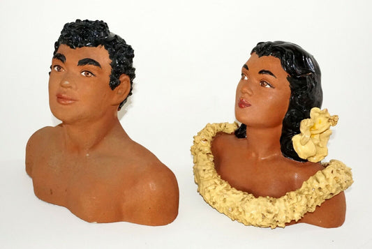 1950s Hawaii Painted Pottery Busts Kane & Wahine by Julene Honolulu Repair (BeG)