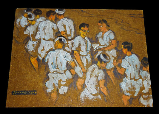 1956 Indian Oil Painting "Standing in Line" by Abdul Appabhai Almelkar (Noz)