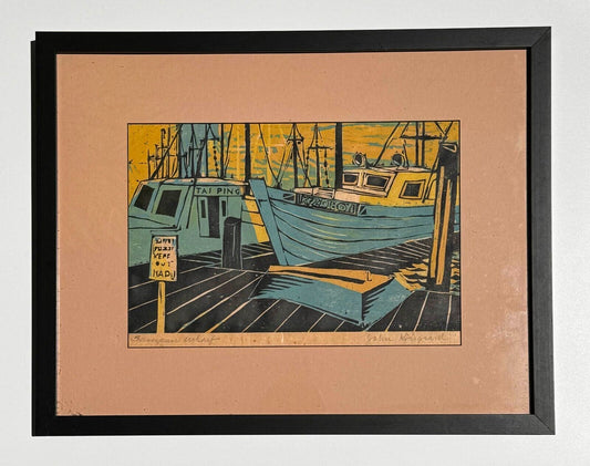 1955 4-Color Woodcut "Sampan Wharf" by John I. Kjargaard (KuK)