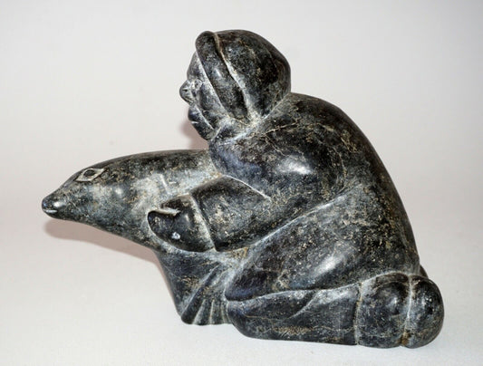 1970s Canada Eskimo Stone Carved Hunter & Walrus Sculpture signed illegibly(Kor)