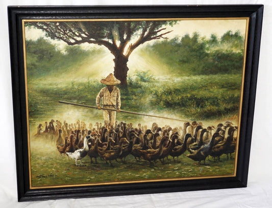 1970s Chinese Framed Oil Painting Man Herding Ducks by S.W. Liou (HoJ)