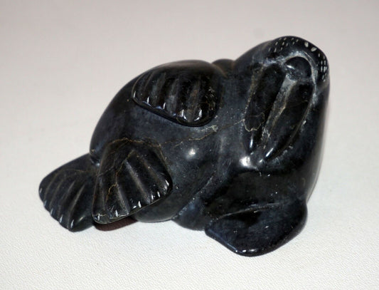 1970s Canada Eskimo Stone Carved Walrus Sculpture signed w. Igloo Tag (Kor)