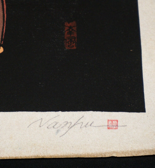 1980s Japanese Color Block Print on Silk "Jester w. Telescope" by Nanhu? (Hic)