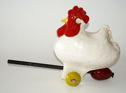 1980s US Pottery "Big Big Chicken" Egg Piggy Bank on Wheels sign AKM (TaE) IC