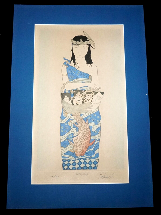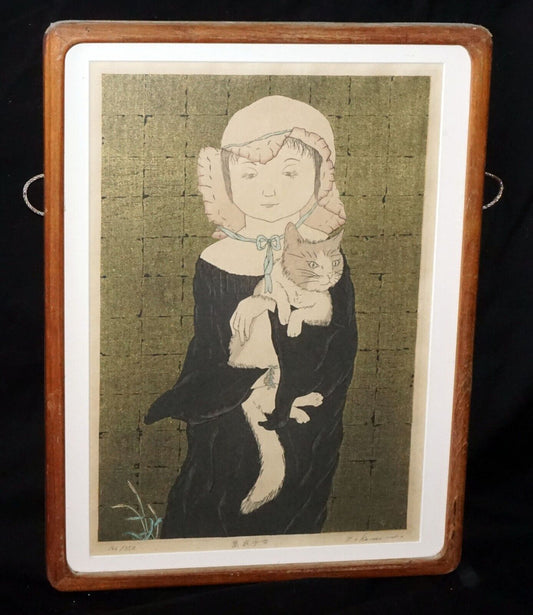 1985 Japanese Color Block Print "Girl & Cat" by Yoshimi Okamoto (b.1949) (FeH)