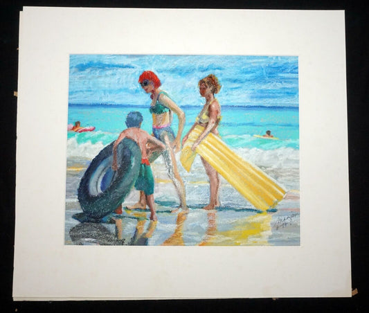 1997 Hawaii Oil Pastel Painting "Windward Beach Goers" by Ingrid Manzione (FeH)