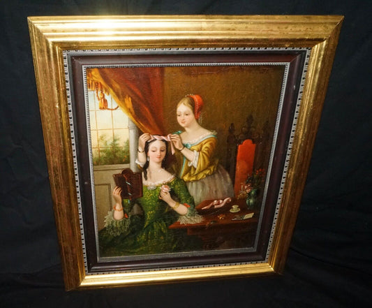 19C American Antebellum Oil- Ladies at Dressing Table Artist Unknown (KoR)