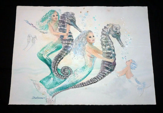 1997 Hawaii Mixed Media Collage Painting Mermaids & Seahorses by Sherburne (Mod)