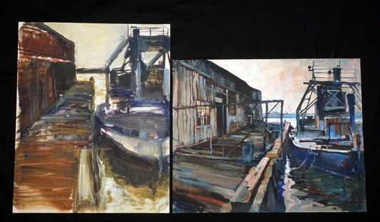 2Pc 1965 New Zealand Oil Paintings Pier & Boat by David Barker (b.1941)(Kel)