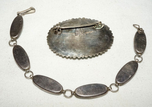 2Pc Vintage Mexican Sterling Silver & Turquoise Bracelet & Brooch Pin (TuD