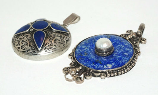 2Pc Vintage Sterling Silver Pendants w. Lapis Lazuli & Sodalite & Pearl (HaL)#18