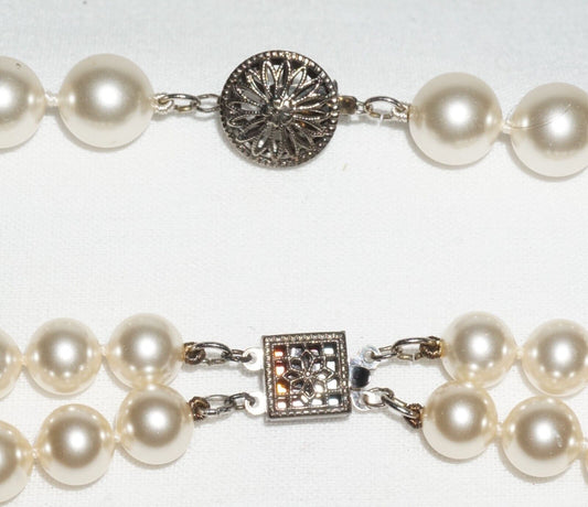 2Pc Vintage Faux Pearl Single & Double Strand Necklaces w. Silver Clasps (BrM)