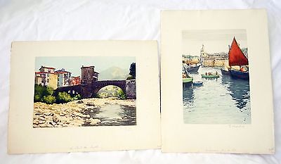 2x 1930s French Travel Color Etchings Prints Alpine & Port Scene signed (Gem)