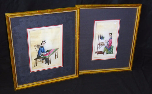2x 19C Chinese Framed Qing WC Paintings on Pith of Seated Fine Ladies (Sul) G#1