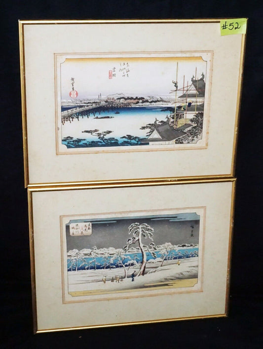 2Pc Vtg. Japanese Framed Color Woodblock print Reproductions by Hiroshige (Wok)