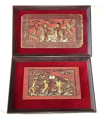 2x 19CT Chinese Framed Carved Red Panels of Scenes w. Figures in Gilt (Gem)
