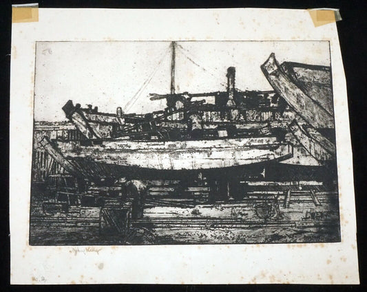 30s Hawaii Etching Print Dry Dock Boats by John Melville Kelly (1879-1962)(Kel)